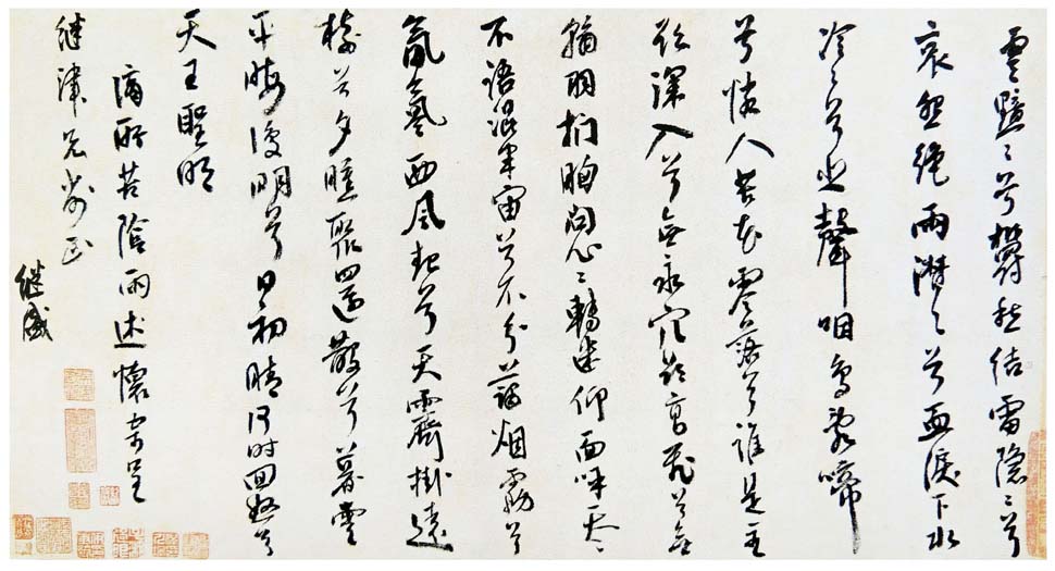 释文:雲黯黯兮鬱愁結雷隱隱兮 哀怨絕雨潸潸兮血淚下水冷冷兮悲聲咽鳥亂啼兮憐人苦花零落兮誰是主欲深入兮無永穴欲高飛 兮無翰羽捫胸問心心轉迷仰面呼天天不語混宇宙兮不分藹烟霧兮氤氳西風起兮天霽掛遠樹兮夕 曛聚還散兮暮雲平晦復明兮日初晴何時回怒兮天王聖明謫所苦陰雨述懷寄呈繼津兄削正繼盛 【资料来源】《中国美术全集》书法篆刻编-5-明代书法