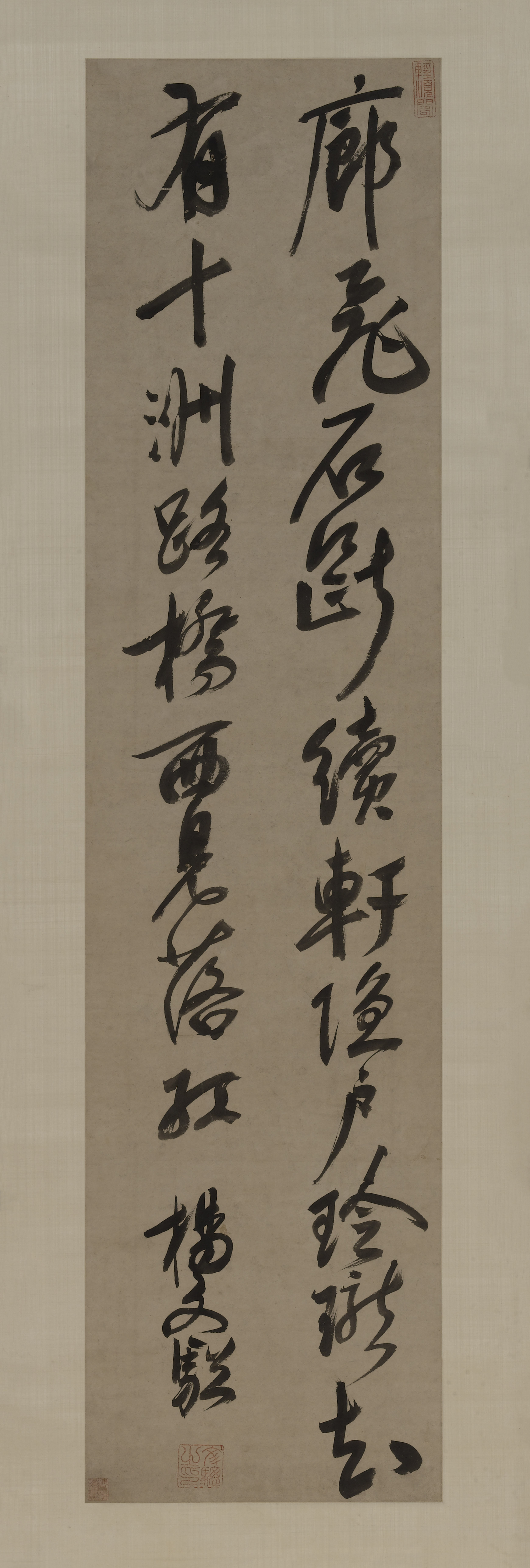 释文:廊飞石断续,轩隐户玲珑。知有十洲路,桥西见落红。 款署:杨文骢。 钤印:文骢之印(朱文) 【资料来源】《中国美术分类全集-中国法书全集》-16-清1(文物出版社,中国古代书画鉴定组,图版 P96;图版说明 P13) 上海博物馆网站