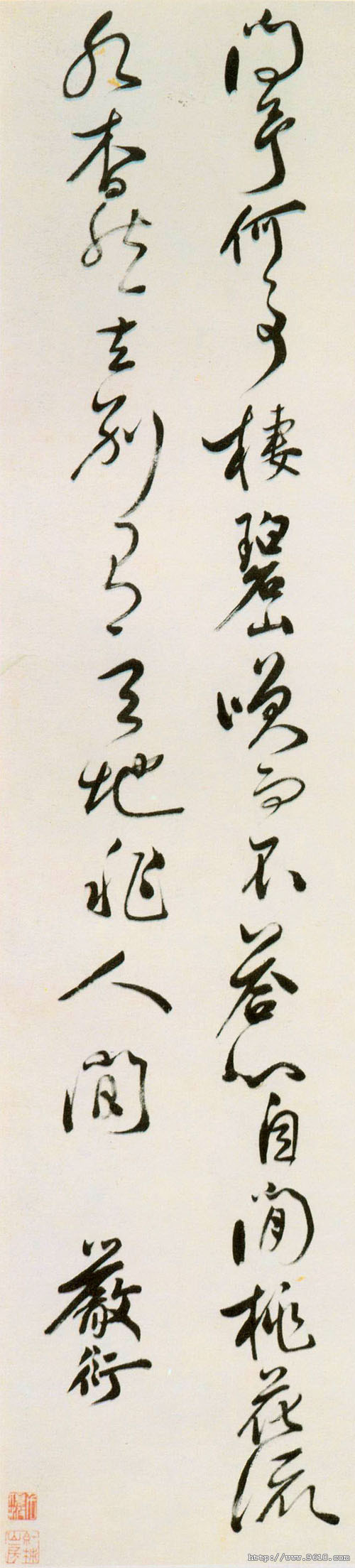 释文:问余何意栖碧山,笑而不答心自闲。桃花流水杳然去,别有天地非人间。 严衍