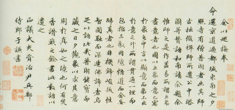此作是于谦应北京夕照寺僧普朗之请,为其师古拙俊禅师遗存的《公中塔图并赞语》所作题记。从所具官衔判断,作品应书于明正统年间,于谦40余岁时。此书体势仿趙孟頫,但点划更加圆阔遒劲,别具一派峻拔清刚之气象。 (撰稿人:华宁)