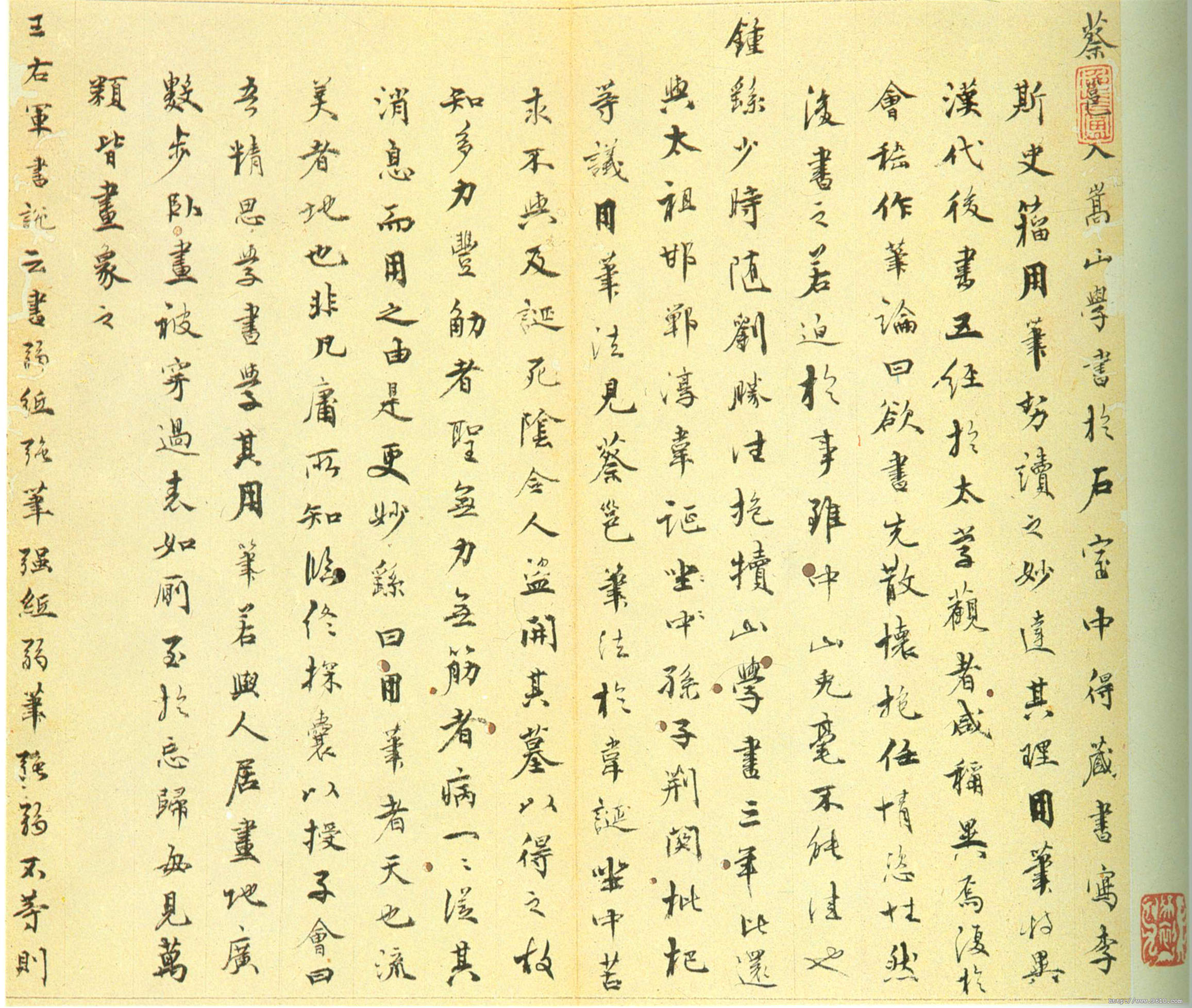 字仲蔚,昆山(今江苏昆山)人。少工临池,久而益擅之。小隶驶驶欧、柳而上,登吴兴(赵孟頫)堂;行书出入褚遂良,稍纵之则米芾;八分自谓得西岳碑体,以方韩、蔡,蔑如矣。卒年六十八。