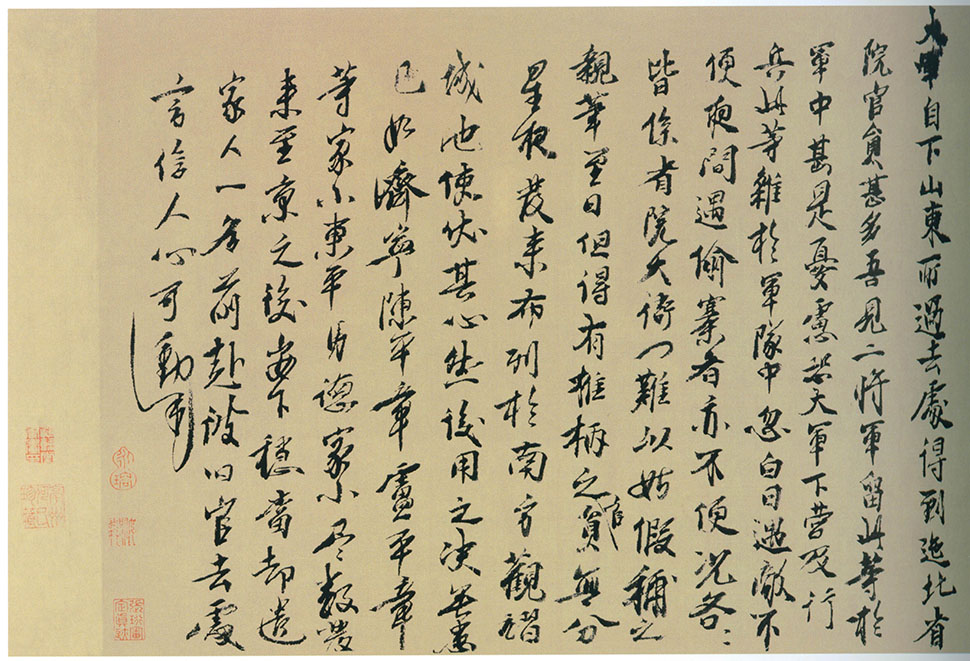 释文:大军自下山东,所过去处,得到迤北省院官员甚多。吾见二将军留此等于军中,甚是忧虑。恐大军下营及行兵,此