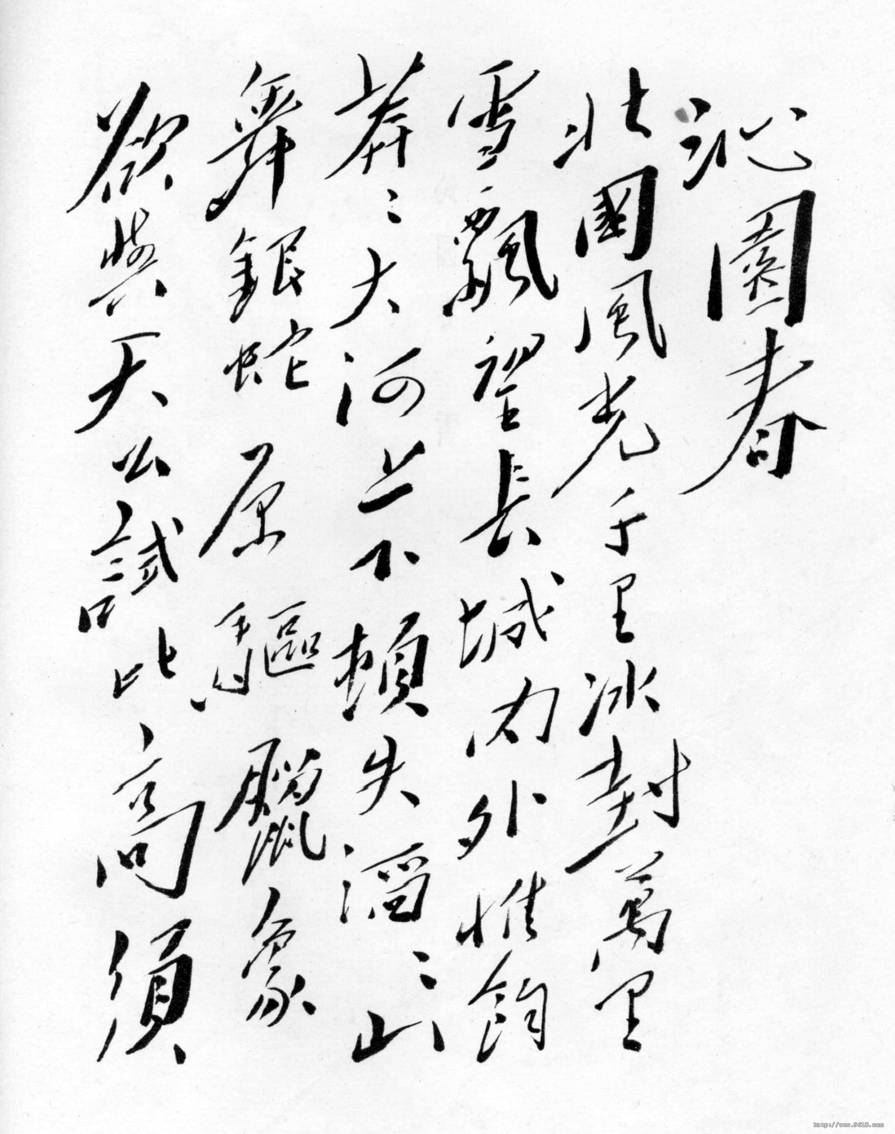 北国风光,千里冰封,万里雪飘。 望长城内外,惟馀莽莽;大河上下,顿失滔滔。山舞银蛇,原驰蜡象,欲与天公试比高。 须晴日,看红妆素裹,分外妖娆。