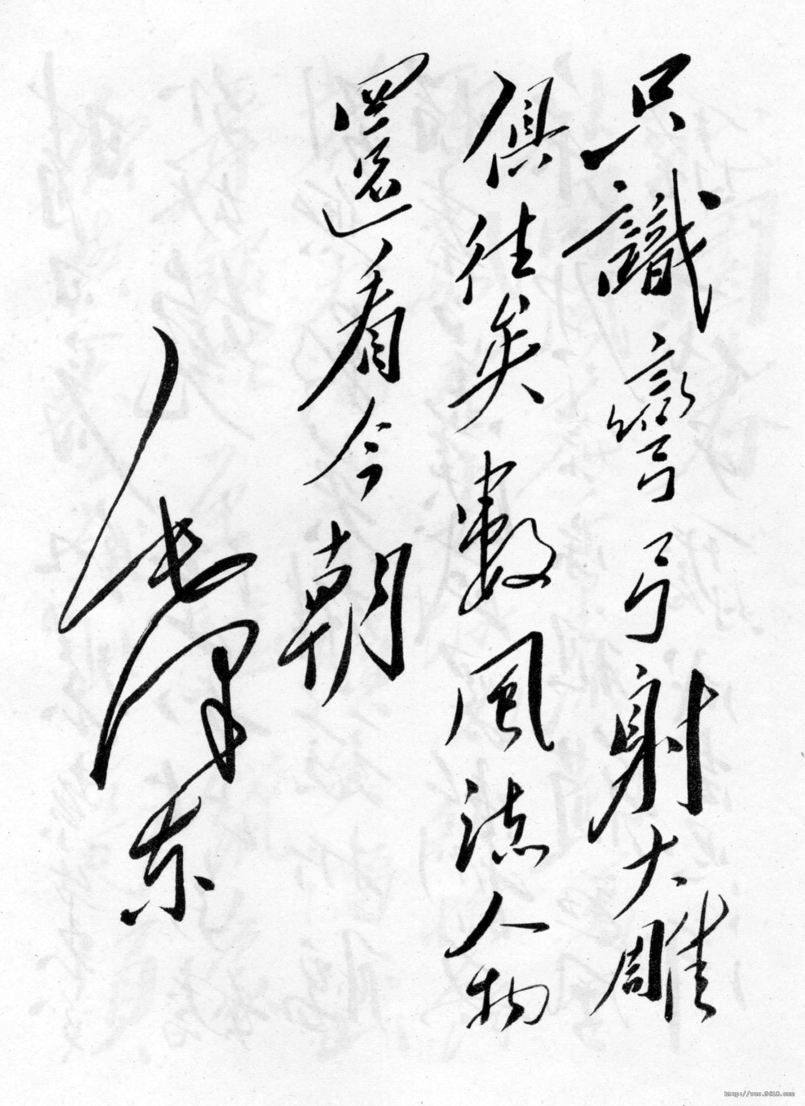 江山如此多娇, 引无数英雄竞折腰。 惜秦皇汉武,略输文采;唐宗宋祖,稍逊风骚。 一代天骄,成吉思汗,只识弯弓射大雕。 俱往矣,数风流人物,还看今朝。