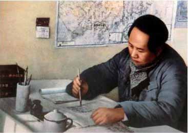 1921年到1949年,可谓第二阶段。在建党初期,特别是在上世纪三四十年代那战火纷飞的环境中,他运筹帷幄,为使机要人员传达准确迅速无误,他起草的文电多是行(书)而不是草。三十年代字体清秀,字形略长,上下自左向右略有倾斜。1941年以后变为自右向左略有倾斜,如1941年致毛岸英、毛岸青的信及其前后起草的大量文电等。