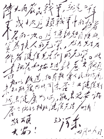 《永昌演义》前数年为多人所借阅;近日鄙人阅读一过,获益良多。并已抄存一部,以为将来之用。作者李健侯先生经营此书,费了大力,请先生代我向作者致深切之敬意。此书赞美李自成个人品德,但贬抑其整个运动。实则吾国自秦以来二千余年推动社会向前进步者主要的是农民战争,大顺帝李自成将军所领导的伟大的农民战争,就是二千年来几誓词这类战争中的极著名的一次。这个运动起自陕北,实为陕人的光荣,尤为先生及作者健侯先生们的光荣。此书现在如按上述新历史观点加以改造,极有教育人民的作用,未知能获作者同意否?又健侯先生近来健康如何,能来延安一游否?统祈转致健侯先生为祷!