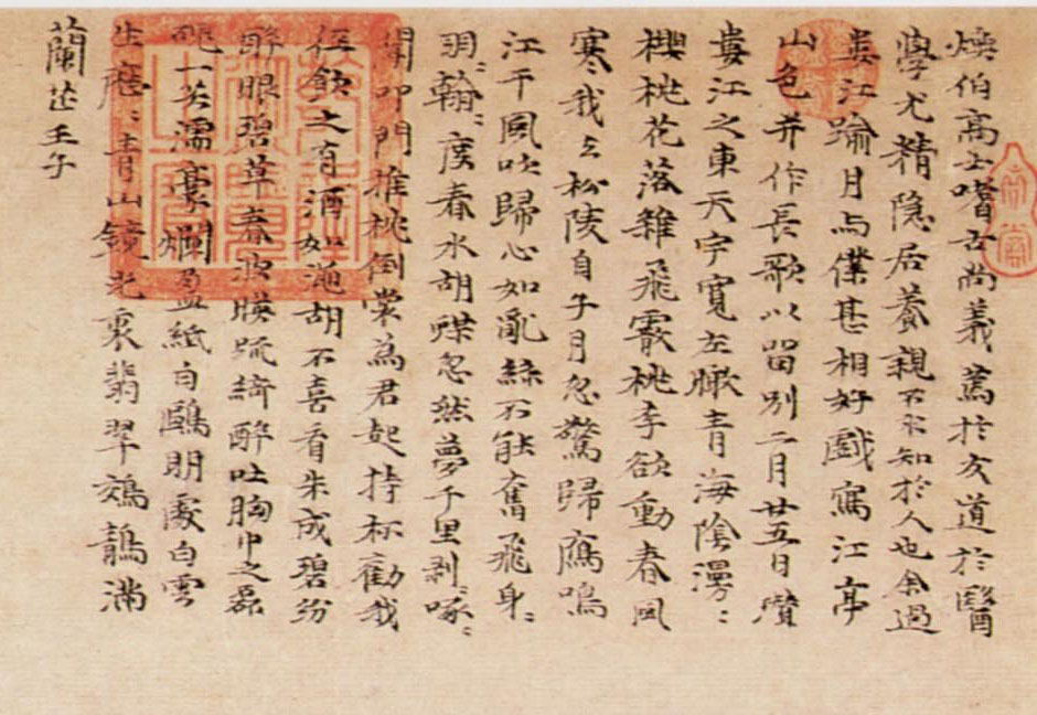 其三,上拍本《江亭山色图》之书法长题,矫揉造作,无骨力,书法功力极差,明显抄袭自台北故宫藏本。台北故宫藏本右上角倪瓒所书长题,介绍了《江亭山色图》为谁而作及其由来。款文曰:“焕伯高士嗜古尚义,笃于友道,于医学尤精,隐居养亲,不求知于人也。余过娄江逾日,与仆甚相好,戏写江亭山色并作长歌以留别,二月廿五日,瓒。”款后为倪所作长歌,全部题书190余字。由题文中可知,《江亭山色图》是倪瓒特意为外游时相识的一位友人焕伯高士留别而绘。倪云林的书法也是极具传统功力与个人特色的。他的书法受褚遂良影响较大,有些点画如“戈”法明显是褚体之法,写的十分妩媚。其书法还掺杂了隶书与六朝写经的风格,这可能与他信奉道教熟悉经体有关,从而使他的书法具有一种仙风道骨的古意与洒脱。他题画有时飘逸草率,多有连笔,如北京故宫藏《竹枝图》。有些写的则工工整整,一笔不苟,如《江亭山色图》,书体为小楷,楷中含隶,毫无泄怠,极见功力。字数如此多的小楷题画,在其画作中极少见。反观上拍本之题书,骨力尽失,神韵全无,火气浮躁。