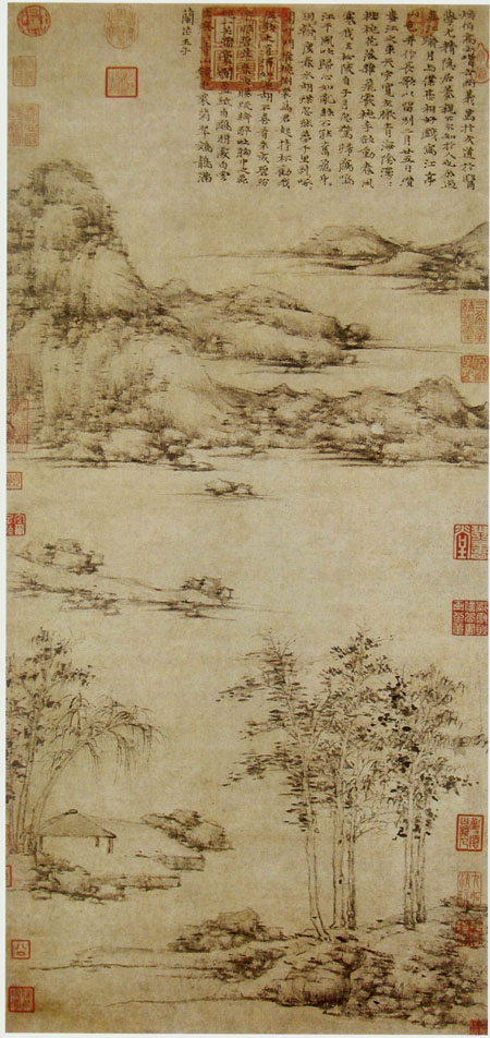 倪瓒的山水初宗五代荆浩、关仝,后受董源影响较大,然晚年遁入江湖后他始自创家法,笔墨、构图与意境均迥异前人,独具一格。在笔墨处理上,倪瓒的线,无论山石,还是树之勾勒多用折带皴,侧锋行笔,枯涩苍劲,给人一种秀峭厚重之感。在用墨上,他更是大胆运用干笔,多皴擦少渲染,干笔皴擦,惜墨如金,形成“干中见湿,躁中带润”的笔致,这种独特的笔墨表现是前无古人的。在山水构图上,由于他流浪太湖四周20年,所见自然景色多疏林平沙、茅亭草舍、小桥流水,故这些景色成为他描绘取材的对象。我们看他所绘的山水,大多近景为几棵疏树、一座空亭,中间空白若茫茫湖水一片,远景再画几座远山,表现了太湖一带水润天高的幽远景色,他这种平远式山水构图确实是别出新意。倪瓒独特的笔墨表现及构图,使他的山水画呈现一种清淡萧疏、逸气高古的超凡意境。倪云林山水画的这种“逸”的境界与格调,是他个人高深学养与独特人生经历的产物,是后人难以企及且极难临仿的。