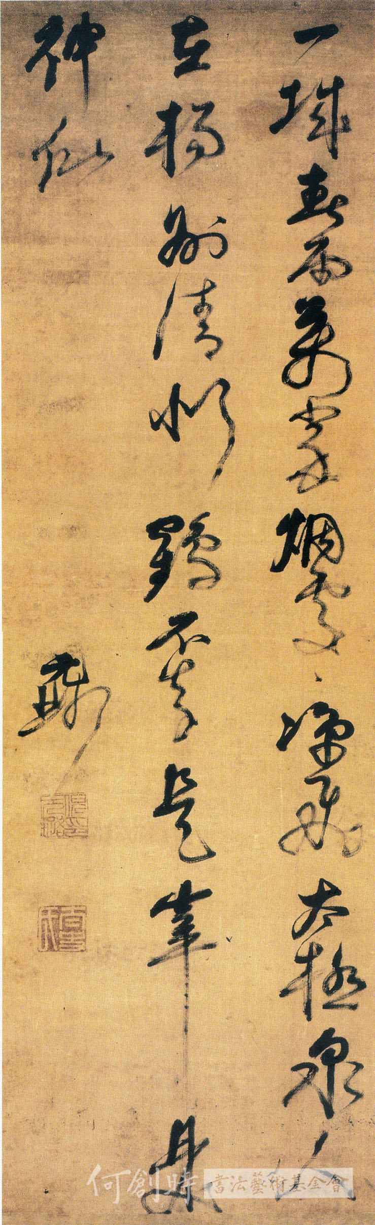 倪元璐《“一城春雨万家烟”七言诗轴》 绢本行草书,127×40cm。台湾何创时书法艺术基金会藏