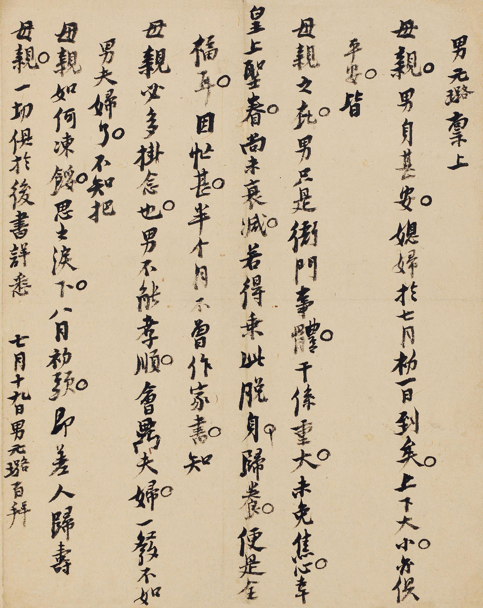 释文:男元璐禀上母亲。男身甚安。媳妇于七月初一日到矣,上下大小,亦俱平安,皆母亲之庇。男只是衙门事体,干系重大,未免焦心。幸皇上圣眷,尚未衰减,若得乘此脱身归养,便是全福耳。因忙甚,半个月不曾作家书,知母亲必多挂念也。男不能孝顺,会鼎夫妇,一发不如男夫妇了,不知把母亲如何冻馁,思之泪下。八月初头,即差人归寿母亲,一切俱于后书详悉。七月十九日,男元璐百拜。