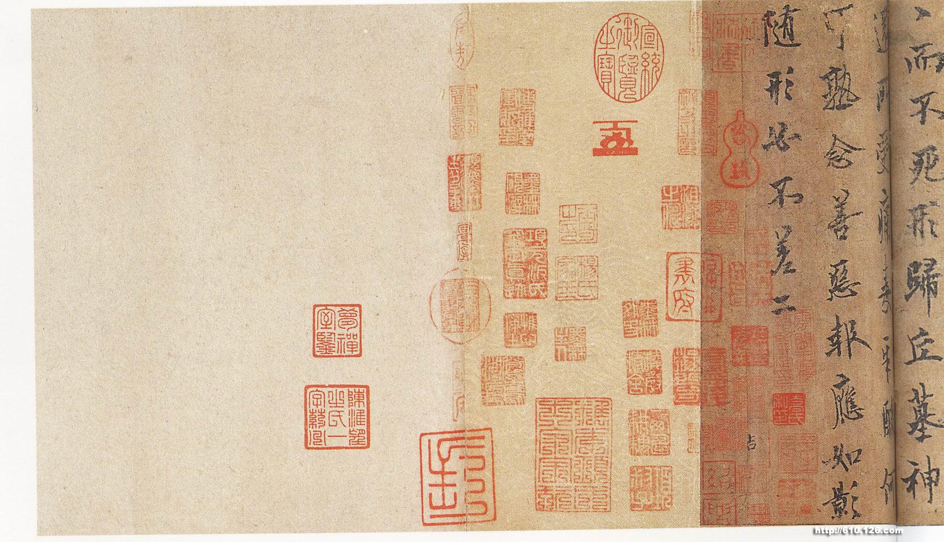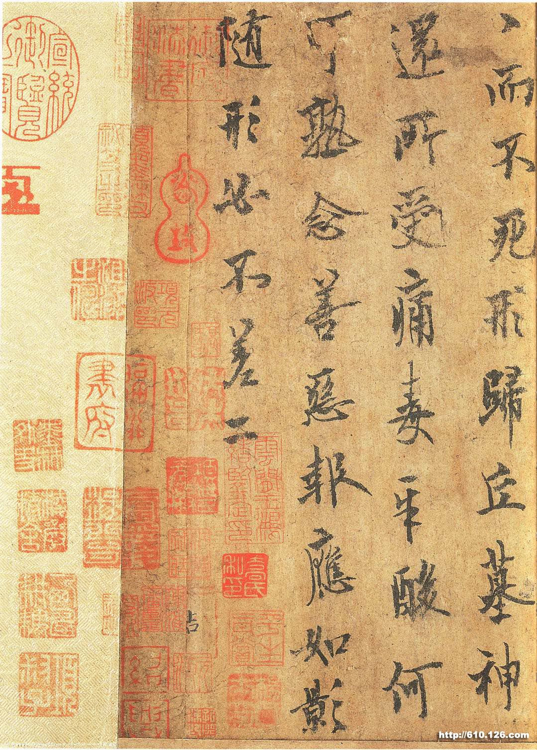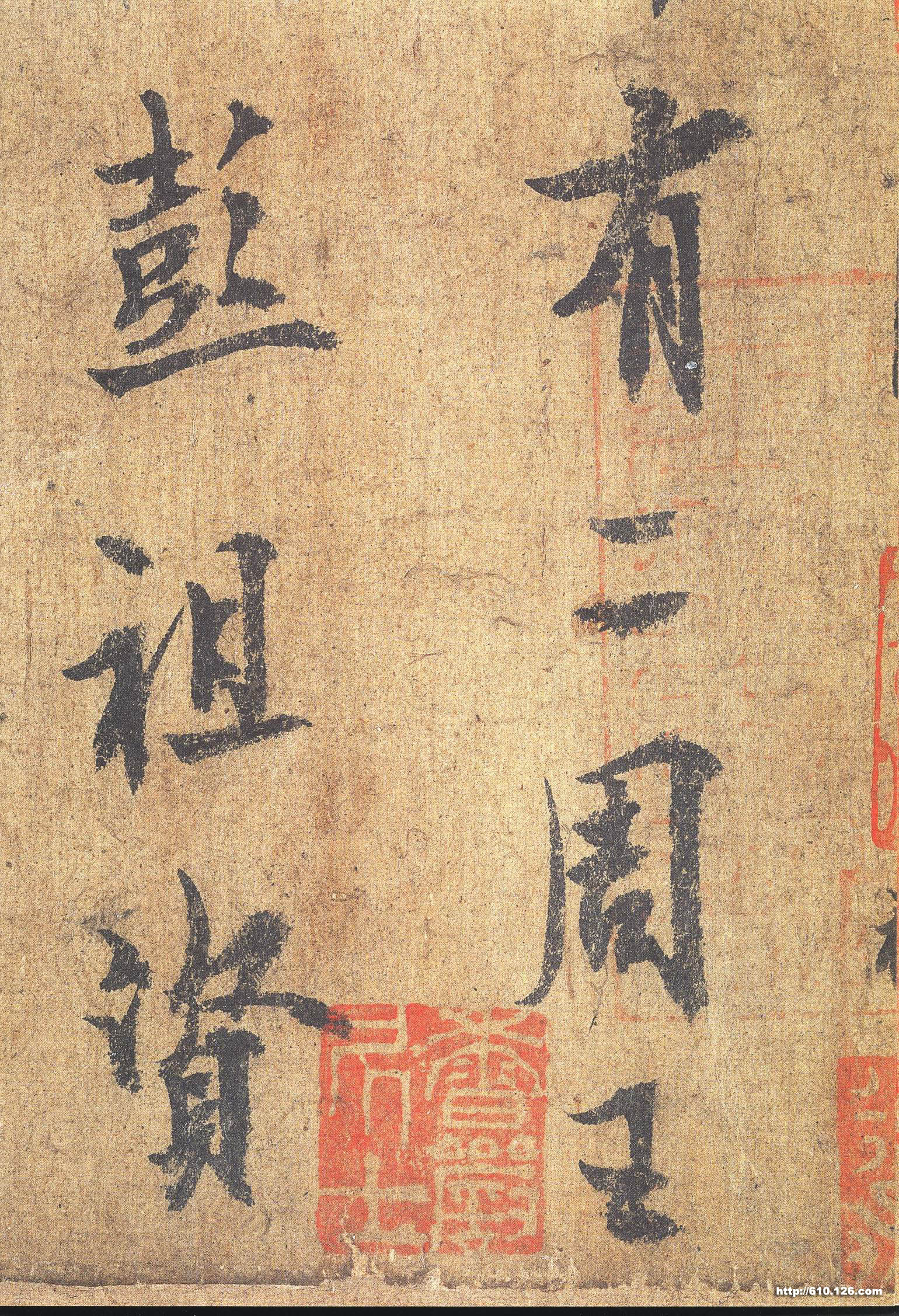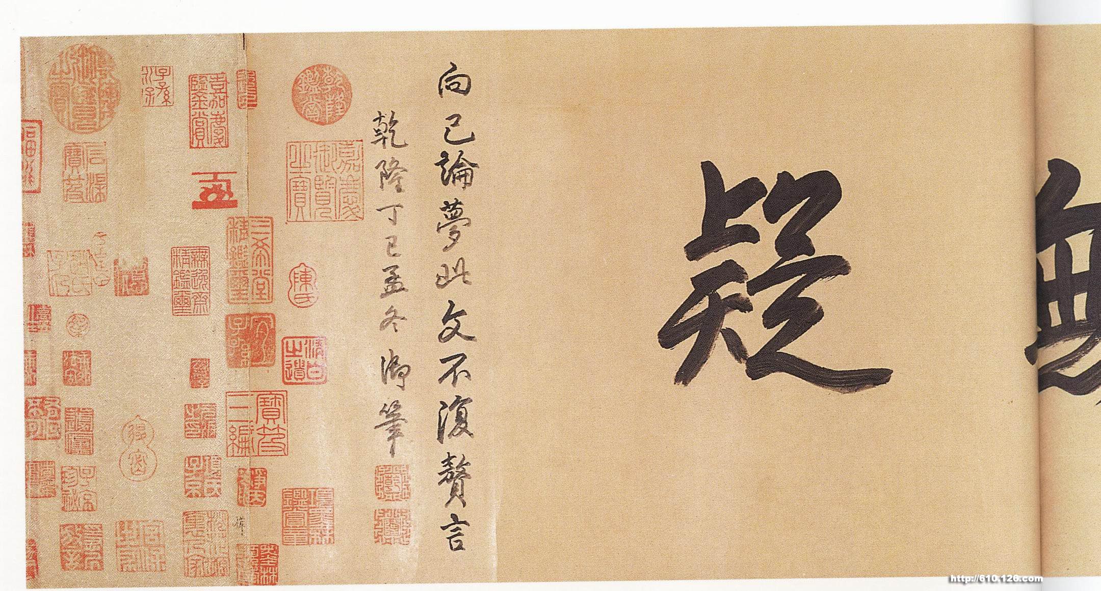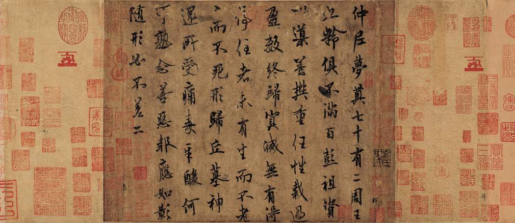 全称《仲尼梦奠帖》,本帖无款印,纸本 25.5×33.6CM,七十八字,书法笔力苍劲古茂。曾入南宋内府收藏,钤有南宋"御府法书"朱文印记两方,"绍""兴"朱文连珠印记,后经南宋贾似道,元郭天锡、乔篑成,明杨士奇、项元汴,清高士奇、清内府等递藏。现藏于辽宁省博物馆。