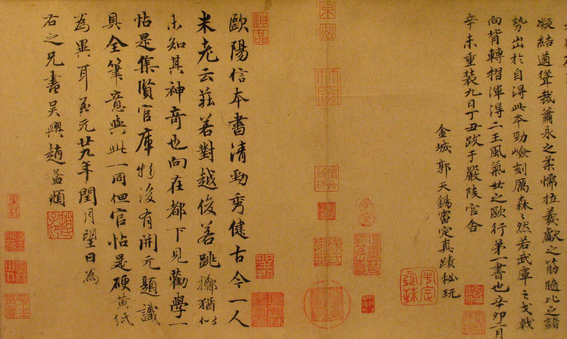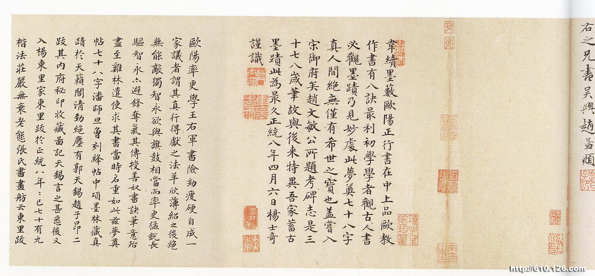 明 杨士奇:韦续《墨薮》欧阳正行书在中上品,欧教作有八诀,最利初学学者。观古人书,必观墨迹,乃见妙处。比《梦奠帖》七十八字,真人间绝无仅有希世宝也,盖尝入宋御府矣。赵文敏公所题考碑誌是三十七、八岁笔,故与后来特异。
