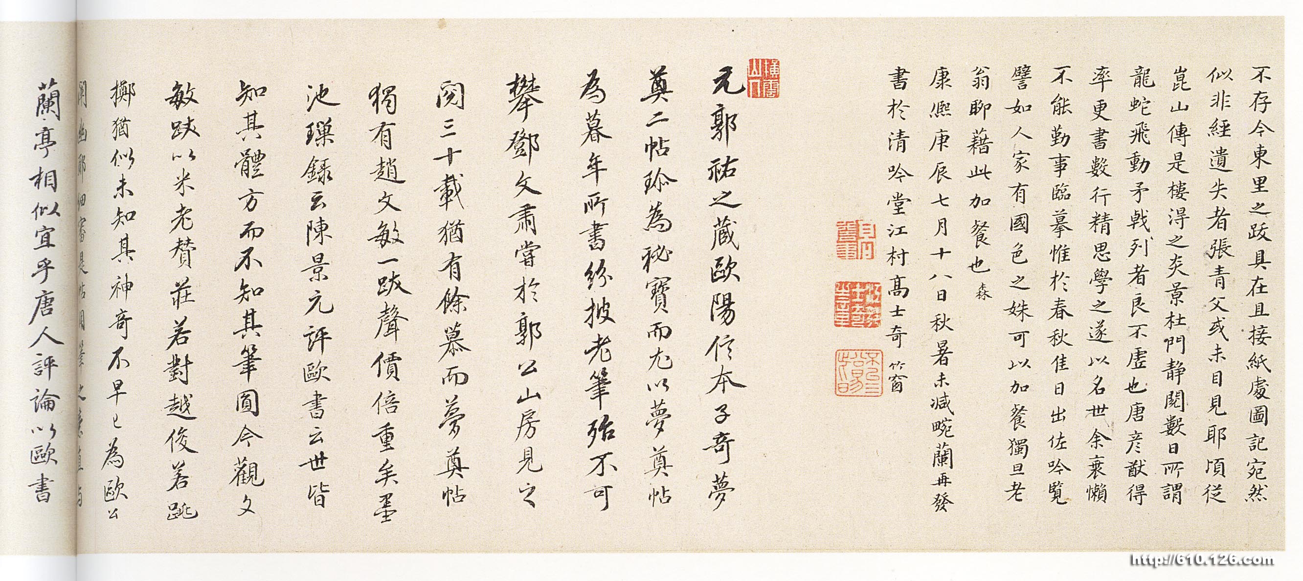 清 王鸿绪:细审是帖用笔之意,直与《兰亭》相似,宜乎唐人评论以欧书居褚河南、薛少保之右,不诬也。