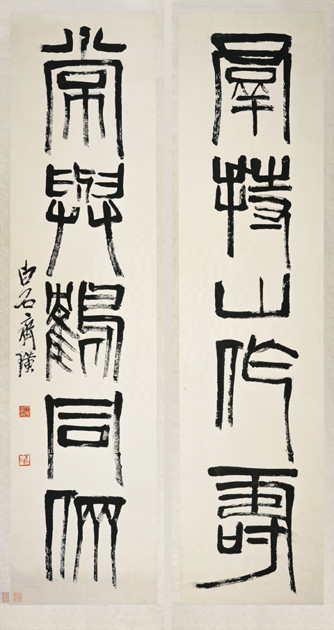 本幅篆书五言联,联文為:“群持山作寿;常与鹤同儕。”白石篆书吸取周、秦、两汉精华,得力於《三公山碑》及《天发神讖碑》。是幅下笔稳健苍劲,极其老辣,应為晚年之作。本幅為蔡辰男先生捐赠与台北故宫博物院。