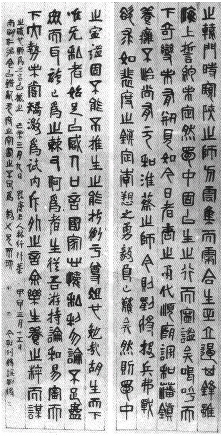 释文:之辕门时窥陕之师方云集而雾合生至立遏其锋虽海上誓约未定然蜀中固以生之行而宁谧矣鸣呼天下奇变未有剏见如今日 者唐之甫代顺庙调和藩镇养痈不治尚有元和淮蔡之师今则刘将投兵弗战欲求如裴度之镇定李愬之勇毅良已难矣然则蜀中之宁谧固不能不推生 之能折冲乎尊俎也勉哉胡生天下唯无私者始足以感人口言国家心怀私利勿论不足蛊众而耳目已为之又何为者生从吾游持论和易审天下大势未尝 矫激为诋内斥外之言余乐生养之粹而谋之臧也则为之言以振之已未四月九日畏庐老人林纾拜稿甲子三月十五日南湖仁弟今以错乱无度之字书之不 足为教也兄齐璜今则列将误刘将