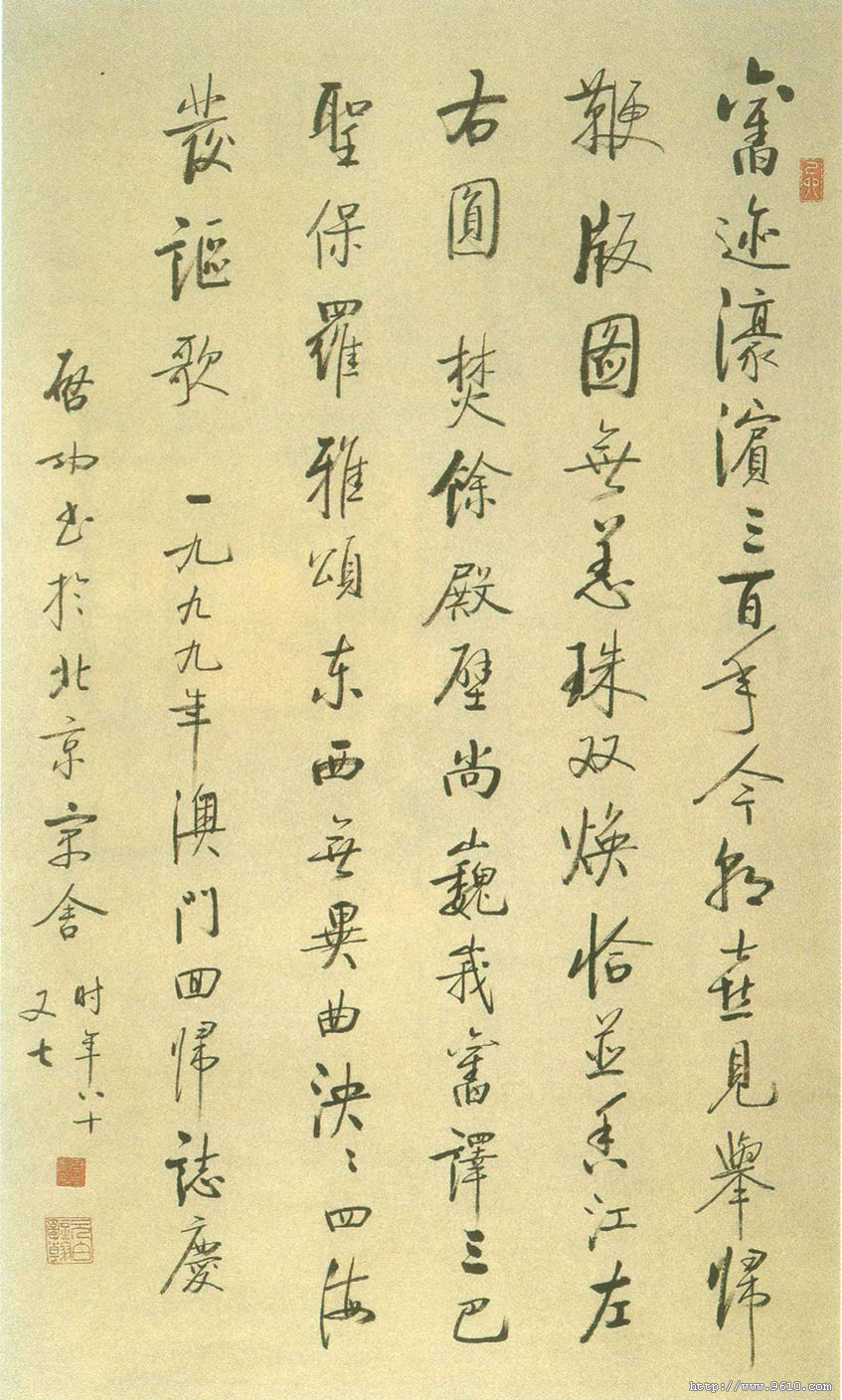 释文: 旧迹濠滨三百年 今朝喜见举归鞭 版图无恙珠双焕 恰并香江左右圆 焚餘殿壁尚巍峨 旧译三巴圣保罗 雅顷东西无异曲 泱泱四海发讴歌 一九九九年澳门回归誌庆 啟功书於北京寓舍 时年八十又七