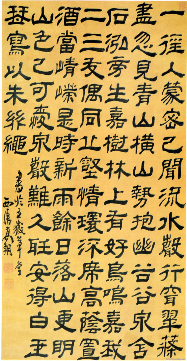 高 翔《隶书五言诗轴》纸本隶书 101.7×51.8cm 上海博物馆藏 释文:略 款署:书于五岳草堂,西唐高翔。 钤印:犀堂高翔(白文)、西唐山人(朱文)、落笔洒篆文(白文) 【资料来源】《中国美术全集》书法篆刻编-6-清代书法(可嘉扫描)