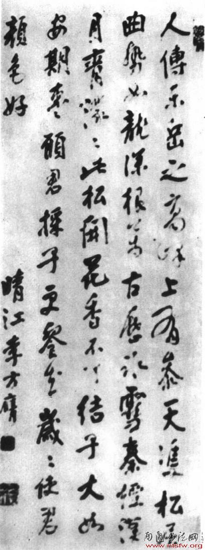 而在节奏的安排上,李方膺也是别具匠心。其1753年所作《苍松怪石》中的题款(图8),此作可谓其题画书法的代表之作。一方面通过楷、行、草三体的杂糅,在一幅作品中杂入楷书、行书,如“岁”、“之”等小部分字用楷书写法,而“复”、“秀”等大部分字则采用行书写法,甚至在其中加入草字写法,如“色”、“无”、“风”等字,楷、行、草三种书体同时出现,通过字形及书写速度的变化来营造书写的节奏感及整体布局上的疏密变化;另一方面则通过墨色的变化,多用枯墨、枯笔,使墨色产生浓淡枯润的变化,如“伦”、“风”等字的枯笔,从而增强作品的节奏感,而枯笔的大量运用也使线条更显苍茫、老辣,线质更为丰富。