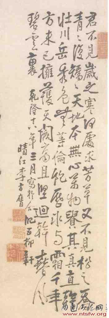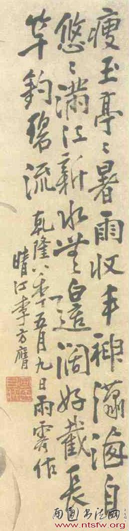 款识:卷却天机云锦段,纵教疋练写秋光。乾隆八年夏五。李方膺。
