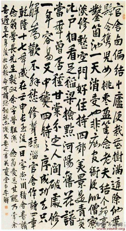 其中年以后的书法仍以行书为主,但早已摆脱了早期学习董书的细腻秀丽之态,董书的靡弱之势一扫而尽,取法上吸收了颜真卿楷书及碑刻的雄强、拙朴、大气,从而具有了放纵恣肆、跌宕起伏、更为雄强的态势,与早期书法相比可谓是脱胎换骨的变化。