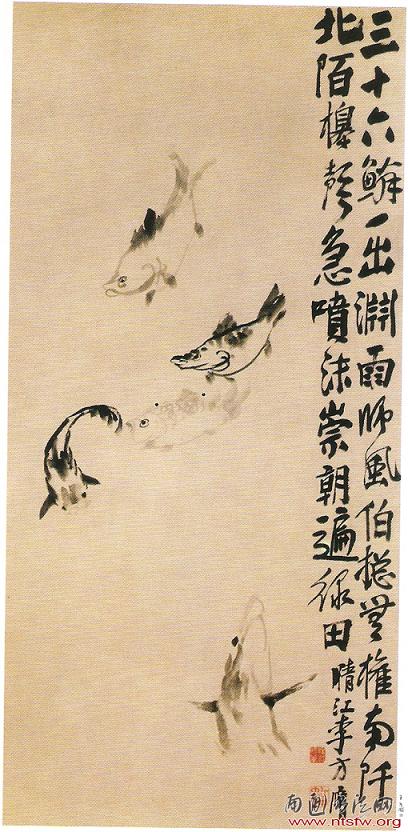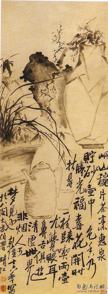 以书入画是文人画的传统,书画融合的观点则自宋、元已经有之。元赵孟頫曾云:“石如飞白木如籀,写竹还应八法通;若也有人能会此,须知书画本来同。”而至杨州八怪,更是将书画融为一体,将题款书法变成绘画中不可或缺的一部分,并将绘画用笔融入书法,或以书法笔法绘画。郑板桥有诗云:“要知画法通书法,兰草如同草隶然”[15],并认为“以书之关纽透入于画”、“以画之关纽透入于书”。[16]