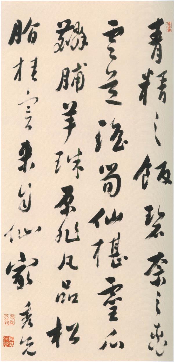 释 文:青精之饭,碧奈之花。雲芝瑶笋,仙椹灵瓜。麟脯羊珠,原作凡品。松脂桂实,来自仙家。 款署:秀先 【资料来源】《中国法书全集》-17-清2(文物出版社)