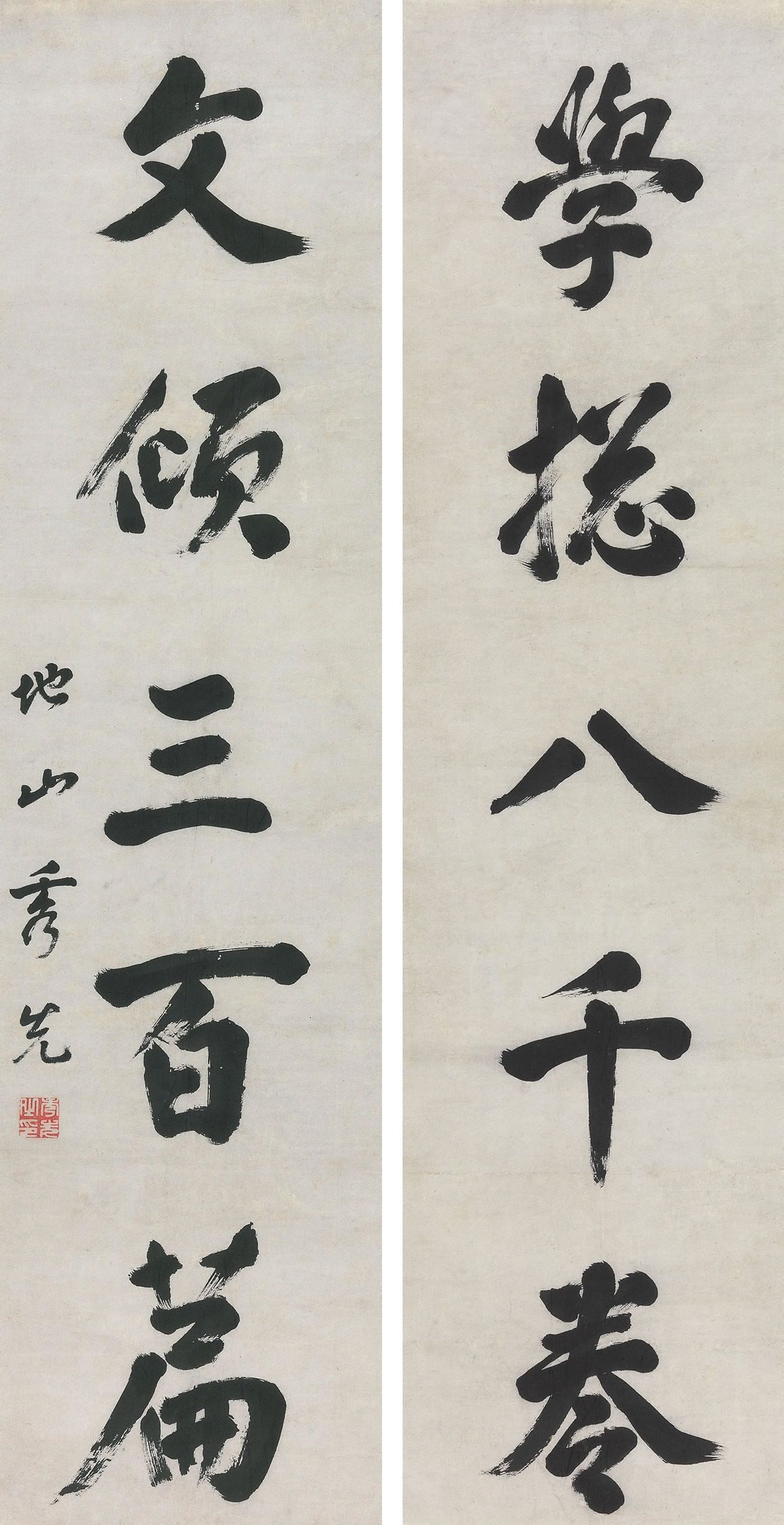 曹秀先《行书学总文倾五言联》纸本行书 107.2 ×29.8cm ×2 澳大利亚新南威尔士州美术馆藏 释文:学总八千卷,文倾三百篇。 款署:地山秀先。 钤印:秀先之印(白文) 【资料来源】 资料来自澳大利亚新南威尔士州美术馆网站