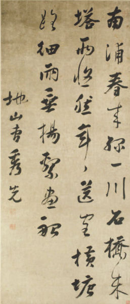 前不久,在南昌市巡展的江西古代乡贤书画作品展中,一幅清代曹秀先的书法中堂(图一)吸引了笔者的目光,内容为范成大的《横塘》诗句:“南浦春来绿一川,石桥朱塔两悠然。年年送客横塘路,细雨垂杨系画船”。作为南昌人,笔者一下就想到,这不是描写的南昌抚河“南浦飞云”一景吗?