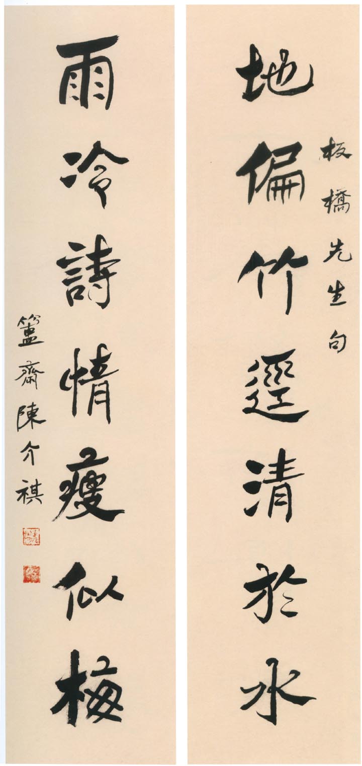释文:地偏竹径清于水,雨冷诗情瘦似梅。 款署:板桥先生句,簠斋陈介祺。
