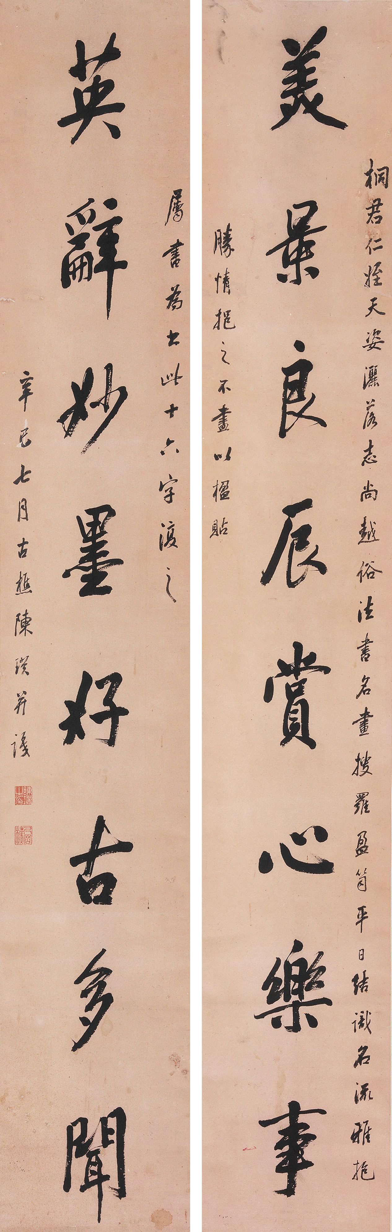 释文:美景良辰,赏心乐事,英辞妙墨,好古多闻。 款署:桐君仁侄天姿洒落,志尚越俗,法书名画搜罗盈笥,平日结识名流,雅抱胜情,挹之不尽以楹贴属书,为书此十六字复之。辛巳七月古樵陈璞并识。 钤印:陈璞之印(白文)、尺冈樵(朱文) 【资料来源】 资料来自澳大利亚新南威尔士州美术馆网站