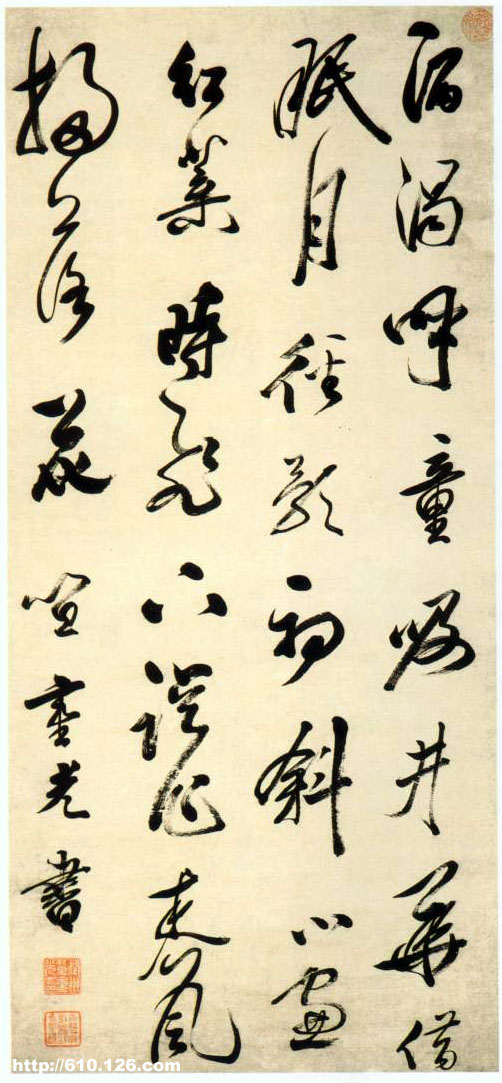 释文:酒渴呼童吸(汲)井华,借眠月径影初斜。小窗红叶时飞下,误作春风扫落花。(明 胡安“客窗杂兴”)——笪重光