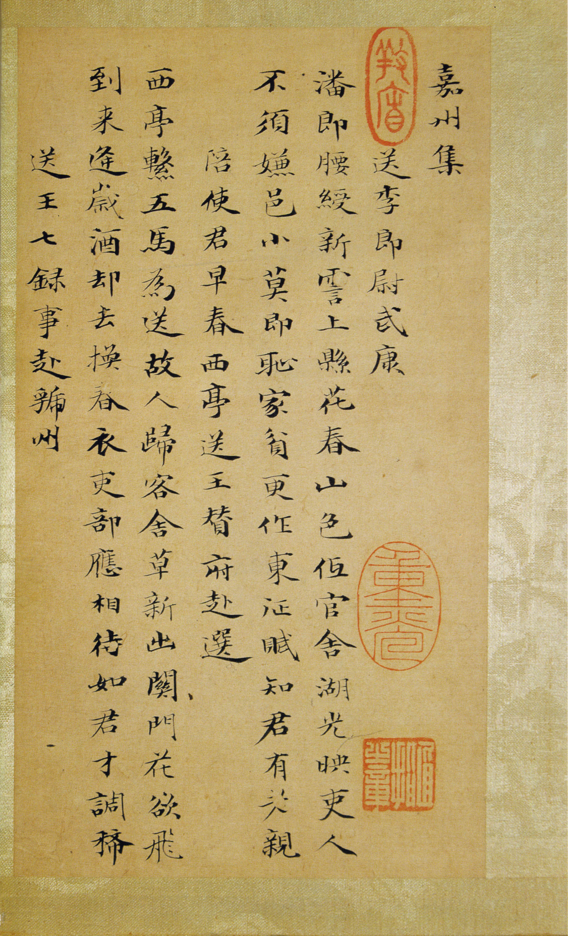 昆仑堂美术馆藏笪重光小楷《嘉州集》一册,录五言律二十四首。《嘉州集》是唐代诗人岑参的诗集,通行本作《岑嘉州集》。岑参官嘉州刺史,因此得名。此册共十开,每开长二十一点五厘米,宽十二厘米,唯独第十开略窄(长二十一点五厘米,宽八厘米)。又册中诗题与诗往往分布前后两页(凡四处),一处则诗中分为两页,疑此作原为一小手卷,后割裱成册。册前有王文治题署,曰“江上先生真迹,松下清斋鉴藏,文治”,钤“王氏禹卿”朱文印,弥足珍贵。王文治称笪重光“小楷法度尤严,纯以唐法运魏晋超妙之致……以《曹娥》仰追《宣示》,乎登钟傅之堂矣。”(《快雨堂题跋·笪江上书江冷阁集序》)观此册字形宽展,捺画闲闲逸出,颇见雅意,亦合于“气之舒展在撇捺”(《书筏》)。此册前后共钤笪重光印十一枚(其中“直指之章”“江上笪氏图书印”重复),册尾钤“笪”“笪重光印”诸印以代款字,亦颇具一格。