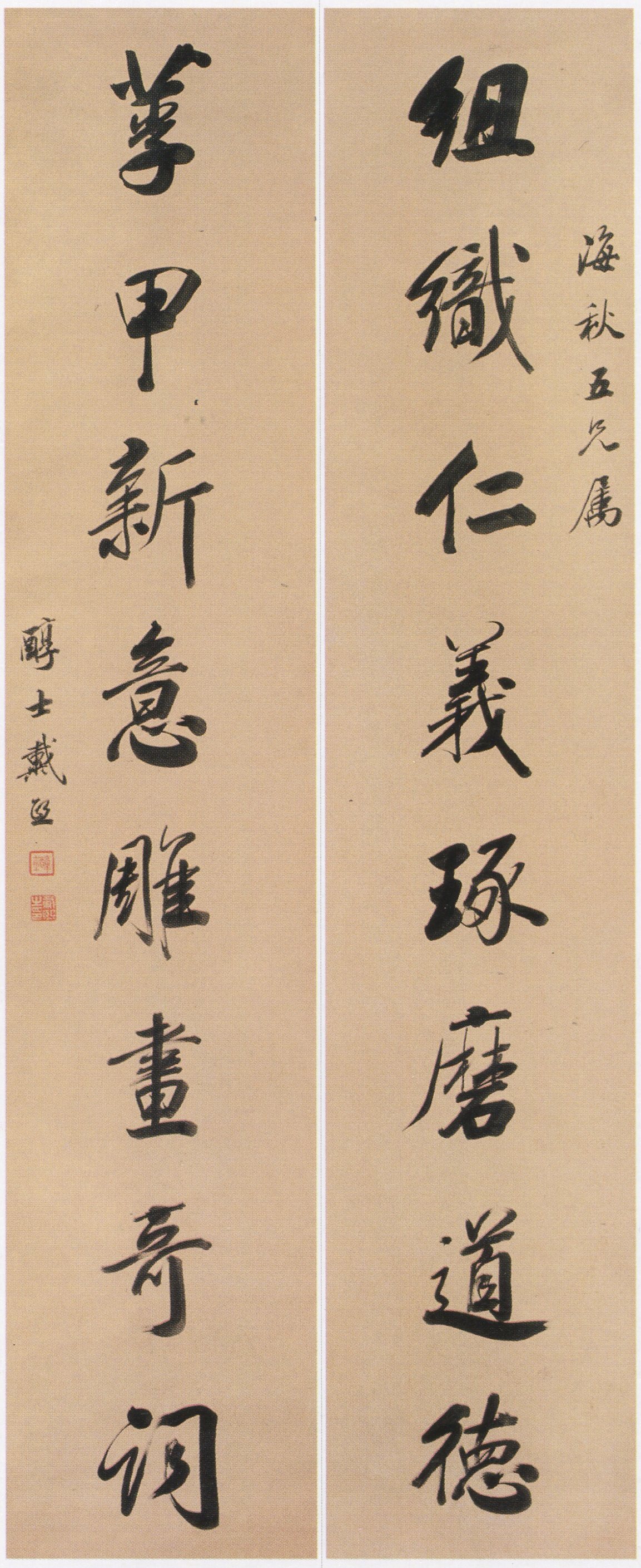 戴熙《行书组织莩甲八言联》 珊瑚笺行书 165×31cm×2 常州博物馆藏 释文:组织仁义,琢磨道德;莩甲新意,雕画奇词。 款署:海秋五兄属,醇士戴熙。 钤印:醇士(朱文)、戴熙之印(白文)