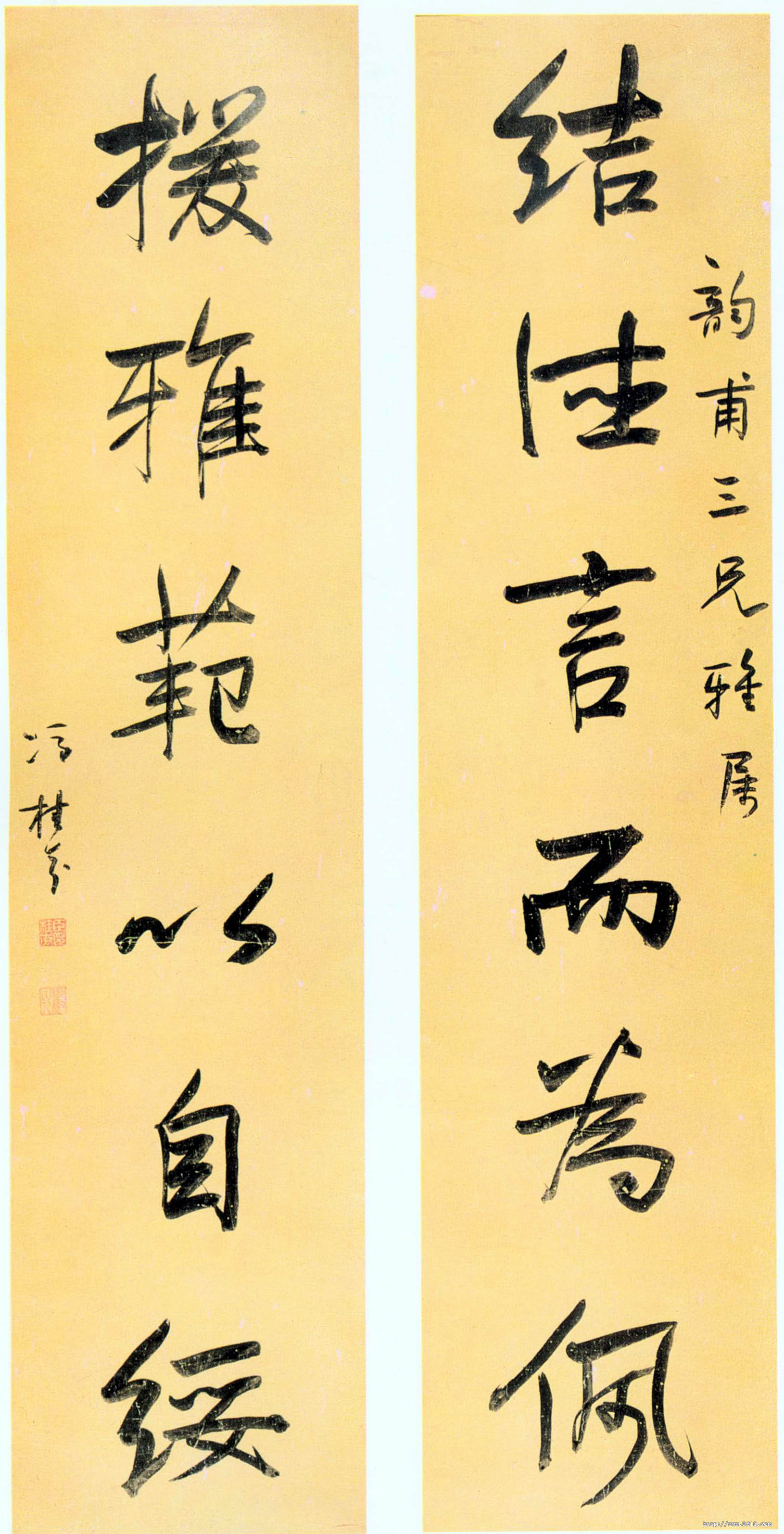 冯桂芬《结德援雅六言联》纸本行书 128×30cm 常州市博物馆藏 释文:结德言而为佩,援雅范以自绥。——韵甫三兄雅属。冯桂芬。