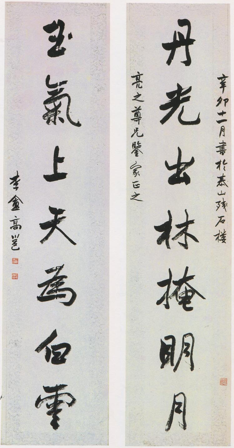 高邕 《行书丹光玉气七言联》纸本行书 131×31.4cm×2 北京故宫博物院藏 释文:丹光出林掩明月,玉气上天为白雲。 款署:辛卯十一月书于泰山残石楼,亮之尊兄鉴家正之。李盦高邕 。 钤印:李盦(朱文)、仁和高邕 (白文)、庚戌邕之(白文) 【资料来源】《中国美术全集》书法篆刻编-6-清代书法