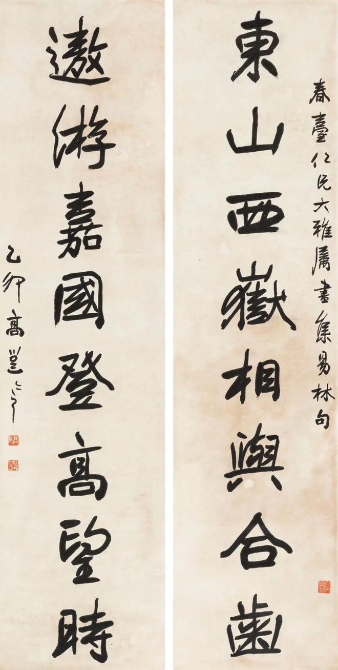 释文:东山西岳相与合齿,遨游嘉国登高望时。 款识:春台仁兄大雅属书,集易林句,乙卯高邕邕之。