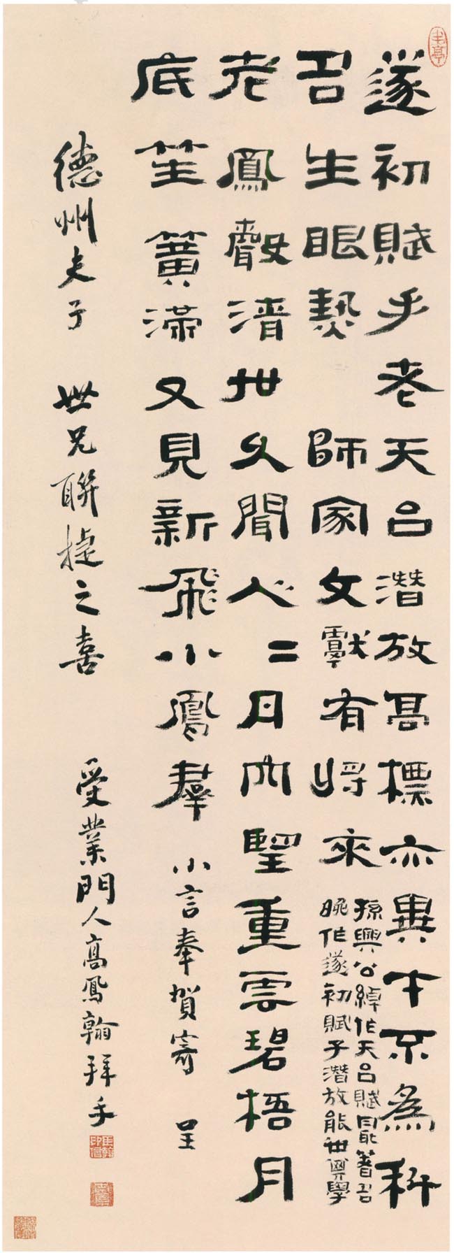 释文:遂初赋手老天台,潜放高标亦异才,不为科名生眼热,师家文献有将来。(孙兴公绰作天台赋最著名,晚作遂初赋。子潜放能世其学。) 老凤声请世久闻,人人丹穴望重云,碧梧月底笙簧满,又见新飞小凤群。 款署:小言奉贺寄,呈德州夫子世兄联捷之喜。受业门人高凤翰拜手。