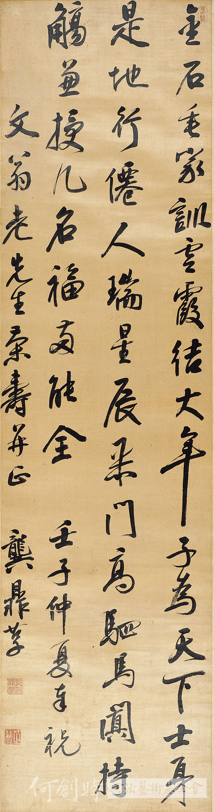 释文:金石垂家训,云霞结大年。子为天下士,身是地行仙。人瑞星辰聚,门高驷马阗。持觞兼授几,名福两难全。 款署:壬子仲夏,奉祝文翁老先生茶寿并正。龚鼎孳。 钤印:“龚鼎孳印”(朱文)、“芝麓”(白文)。 【资料来源】台北何创时书法基金会网站