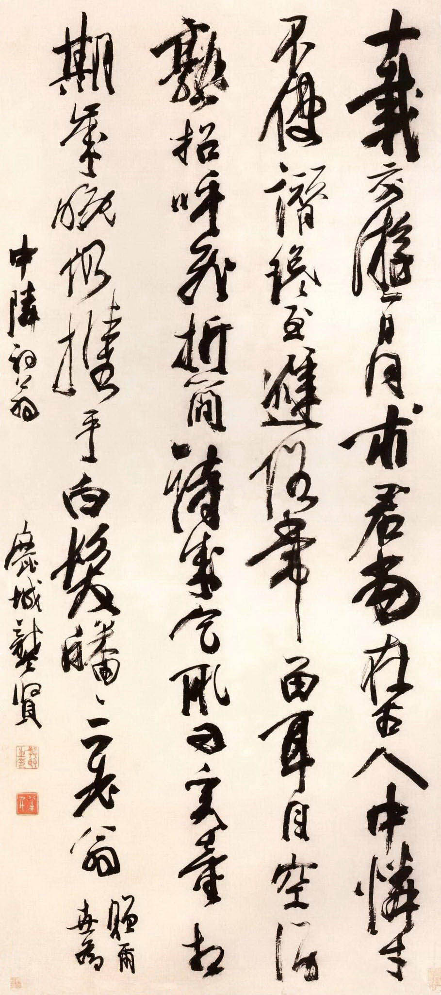 龚贤书画皆擅长,他在绘画中强调用墨,注意明暗层次,讲究虚实对比,景色富有深远、光照感。在书法中他也同样注重用墨的浓淡和布白的虚实。此幅作品墨色浓重,又时出飞白;笔法纵放,又时见粗细变化;结体浑厚,又正欹相依。字距紧密,行间宽裕,疏密、虚实得宜。其变化多端的笔法、结构源自米芾,而墨丰笔健、疏密相生的艺术追求又体现了自家的风貌。(撰稿人:李艳霞)