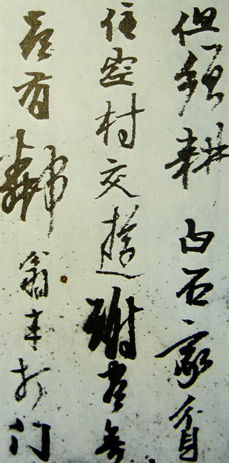 李邕 龚贤中期的一些书作中“斜势”、“险势”明显,很有一些李邕态势。李邕是右军的传承者,龚贤中期书学留连于右军、北海之间,我们从龚氏与右军、北海的字迹对比中,可以看出龚氏这一时期的师承特点。最能体现龚氏中期书法特征的1665年《自书七言绝句册》、1675年《赠周燕及山水册》跋、1679年《赠长翁山水卷》跋等作,是本于右军“圣教序”而融入李北海倾欹体势,像《自书七言绝句册》中,“扫公楼”一首之“扫”、“渡”,“清凉山在屋边头”一首之“台”等即是。不过,龚贤在晚年则倾向于米书式的“斜”与“险”了。