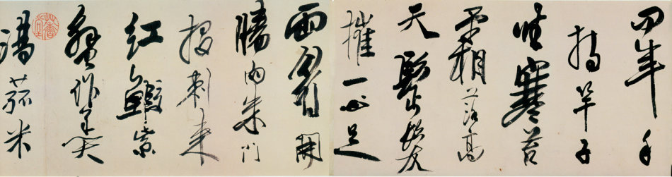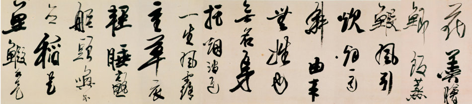 这种捺笔“脚掌”其实早在作者48岁时所书《自书七言绝句册》中已经成形了,但当时的折点和波势还不够夸张。晚期书作中这种捺笔先顿后提再拉出,便有了似连非连的捺笔“脚掌”,也成为龚书招牌式笔画。 这一时期取法重点是米字,比如《自书诗册》与《渔歌子》两卷(湖北博物馆卷、辽宁博物馆卷)等,其中的有些单字甚至直取米书字势、结构,当然作者主要还是将米书丰富的用锋法融于创作,而不止于求形似。此时的书写比中期更多更自如地使用了侧锋行笔,快速扫、刷笔也不鲜见。但应该看到的是,米的影响在龚贤纯书作中体现得更明显,而题画书迹的传统痕迹则不十分明显,挥写更为自如。 中期龚书以棱骨劲健胜,晚期龚书则意在谋求温润、秀逸、灵动的境界。晚期字形变为纵长,字结构较之前略有散放趋势,但笔画依然内敛为主,仍不随意外拓,表现出一种含蓄自抑却又乐观自信的情调。 晚期圆厚温润的书风与同期浑朴厚重秀润的画风亦构成了某种程度的契合。 龚贤《柴丈画说》、《龚半千课徒稿》中谈到了山水技法: “笔法要古,墨气要厚,丘壑要稳,气韵要浑。” “笔要中锋为第一……中锋乃藏,藏锋乃古,与书法无异。笔法古乃疏、乃厚、乃圆活,自无刻、结、板之病。”(44) “画之妙处,在笔圆气厚”(45) “所谓圆者,非方圆之圆,乃画厚之圆也。”(46) 关于“润、圆、厚”,《龚半千课徒画说》中有云: “(树木)苍翠欲滴,此在润不在湿,润墨鲜,湿墨死。” “无论直点扁点,俱宜圆厚。圆,气圆,厚,气厚……”(47) 润、厚、浑是龚贤水墨山水的特色,他四五遍乃至六七遍的皴染是为了增强画的“厚”度并突出体积感。“笔圆气厚”是他中年之后的笔墨追求。“一方面圆厚是画家通过心源对客观物象进行归纳概括之后而产生的与之对应的笔墨语言,另一方面圆厚则是个体的产物,是通过用笔的神圆,而达到一种精神上的‘气’之充裕、丰厚。”(48) 龚画之“润”,体现在画中林木苍秀润滋、峰间雾雨岚烟,这种润的感受与圆、浑的意象互为依存。 龚贤晚年书法同样突出了润、圆、厚的特点,主要集中在那些粗笔重墨单字或字组上,这些字往往以中锋沉实地写出,与细轻笔触(中侧锋兼使、疾速扫出)构成对比。湖博卷《渔歌子》即运用了鲜明的浓淡墨、粗细线对比法。那些润、圆、厚的浓墨重笔字,行笔持稳,曲转为主,点画厚重丰润,而且字数居多,是该作书写和表现的重点,在通篇中起着主导作用。藏于日本的《鱼跃莺啼联》是为数不多的龚书大字作品。从风格看当为与两卷《渔歌子》相距不远时所书,书风相似,更近于辽博卷《渔歌子》,与另一幅大字“题武丹山水卷”也极似。该联中锋用笔,行笔较快,点画雄厚圆转,润、圆、厚的特点尽显,圆笔曲转让整幅对联笔势贯通、极其流畅。 (B)晚期楷书。 龚贤中晚年有一种个性化的楷书写法,如1688年《山水册》(北京故宫博物院藏)第2页“矗天对峙两岸青”一首,笔画粗细均匀,结体有些夸张,局部加入隶书结构,显得稚拙朴雅、天真可爱、饶有画意。北京故宫博物院藏《摄山栖霞卷》跋亦属此类,此卷应作于1676年之后(49),左上角自题摄山栖霞寺诗12行,即属于这种楷体,线条粗细划一,结体夸张而拙朴,跋中的“有无”、“空”等字及“走之”旁有隶意。 《渔歌子卷》(湖北省博物馆藏) 29.3×685.3cm,纸本,八阕,行草书72行。 《渔歌子卷》被看作是龚贤书法代表作,也是其晚期风格代表。晚期书作不再像中期那样以力劲骨势为主,而是以情趣韵致取胜。此卷即显现出一种娴雅之致、柔润之美,而且并不缺少力感,这是一种柔劲韧力,显示了龚氏晚期书法“笔圆气厚”、“墨丰笔健”的特点和润、厚、浑的境界。 点线用笔灵动、飘逸,这得益于中、侧锋的自如转换。一些点线以中锋缓笔写出,圆润厚重;一些字则如米字似的侧锋疾速扫出。此卷也不像同期一些画作题款那样尖锋外露,可能因为这是一卷纯粹的书作,作者有意识地控制着运锋的速度变化,几乎每个字都徐疾有致,并讲求字内细节的处理。 这幅长卷依书写次序呈示出的节奏变化令人印象深刻,这主要依凭字的大小、墨色的轻重以及点线的粗细。一组字常被作为节奏起伏变化的单位,进行浓淡、轻重等交替转化,浓(重、大)→