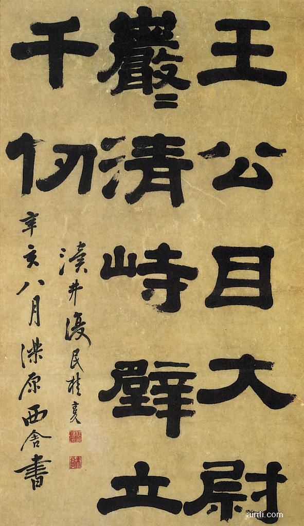 释文: 王公目大尉。岩岩清峙。壁立千仞。 渎井复民桂馥。辛亥(公元一七九一年)八月泺原西舍书。 【印记】钤印二。桂馥信印。未谷。 【资料来源】http://www.airiti.com.cn/pmto/npop.aspx?picno=NPA025004AA