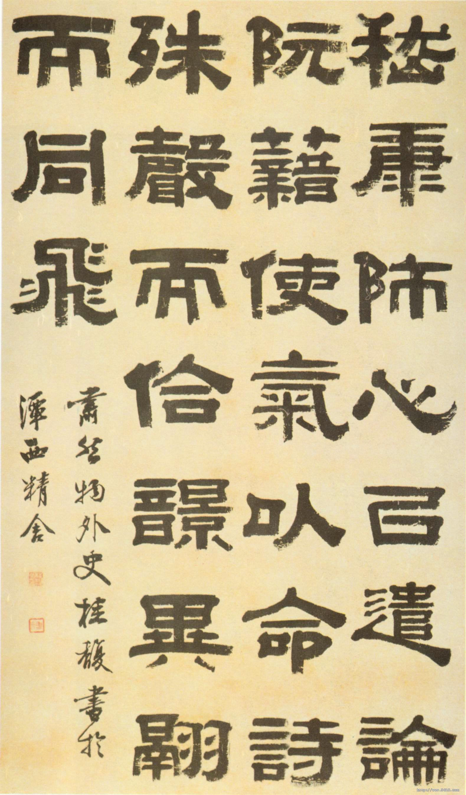 释文:嵇康师心以遣论,阮籍使气以命诗,殊声而佮□(音景), 异翮而同飞。 款署:肃然物外史桂馥书于潭西精舍。 【资料来源】《中国美术全集》书法篆刻编-6-清代书法(可嘉提供)