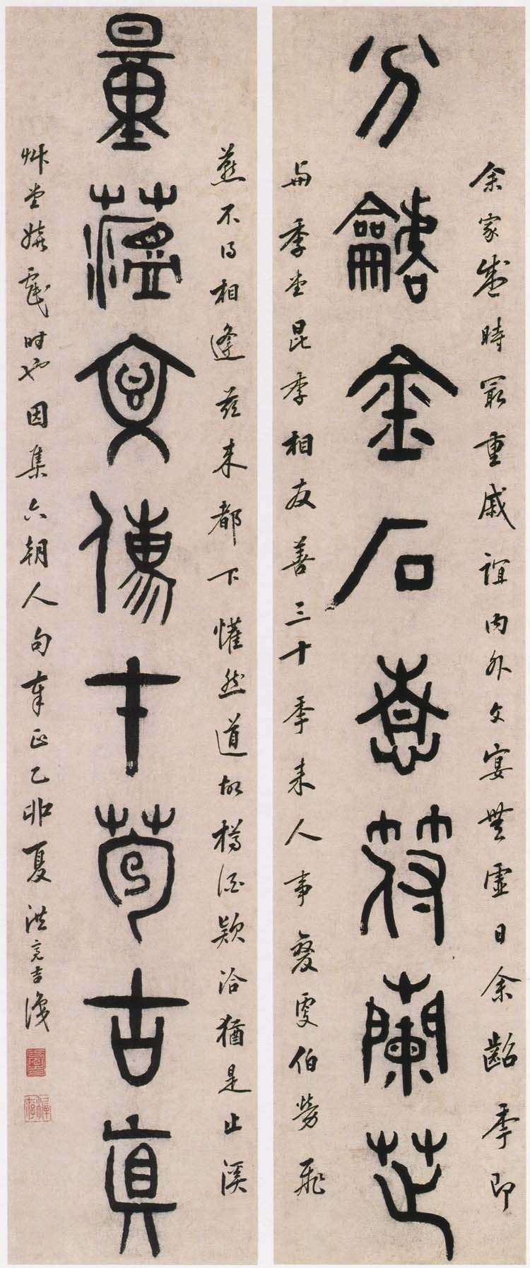 洪亮吉《金文分箎量蕴八言联》纸本篆书 121.2×23.5cm×2 浙江省博物馆藏 释文:分箎金石,情符兰芷;量蕴文传,才苞古真。 款署:余家盛时,最重戚谊,内外文宴无虚日,余龆年即与季堂昆季相友善,三十年来,人事变更,伯劳飞燕,不得相逢。兹来都下,欢然道故,樽酒款洽,犹是止溪草堂嬉戏时也。因集六朝人句奉正。乙卯夏洪亮吉识。 钤印:亮吉(白文)、穉存(朱文) 【资料来源】《翰墨清芬》——浙江省博物馆典藏大系(浙江古籍出版社)