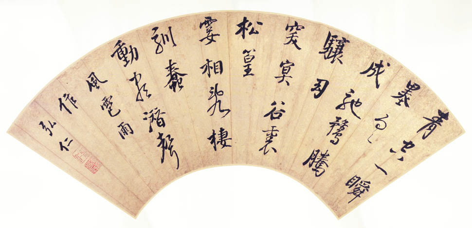 弘仁《行书风雹雨作扇面》 上海博物馆藏 释文:青空一瞬墨雲成,驰鹜腾骧幻突冥。谷里松篁霎相乱,栖驯蠢动尽潜声。 款署:风雹雨作,弘仁。 钤印:弘仁(朱文)、渐江僧(白文) 【资料来源】转自《上海博物馆藏明清书画扇面名品百选》之书法(五十张)