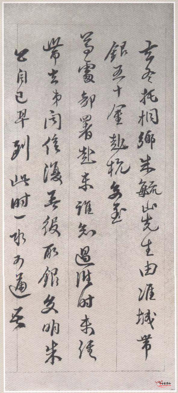 释文: 去冬托桐乡朱毓山先生由淮城带银五十金赴杭,交至尊处部署赴东,谁知过淮时未经带去,弟闻信复差役取钱交明,朱公自己早到。此时一水可通,吾兄定必即来。不特庚拓武梁本弟已得秘诸箧笥,武宅山近日又出有字一版、无字者多版。晋太公庙碑下腹已有,至快至快!吾兄来山,正可清赏也。兹小信之便,特令趋叩,如可同来更妙。至囗九兄有信件,亦可带来。忙中顺候 近祉。馀面悉不一。 晋斋九兄大人 愚弟黄易顿首