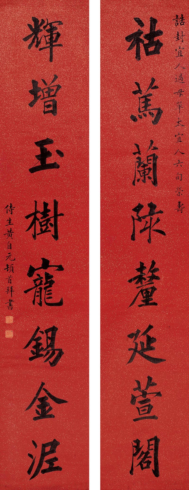 估 价: RMB 10,000-20,000 款 识: 诰封宜人过母单太宜人六旬荣寿。侍生黄自元顿首拜书。 钤印:黄自元印(白) 敬舆(朱) 释文:祜马兰陔厘延萱阁,辉增玉树宠锡金泥。 公司全称: 西泠印社拍卖有限公司 拍卖会名称:2005年首届大型拍卖会 拍卖日期: 2005-07-02