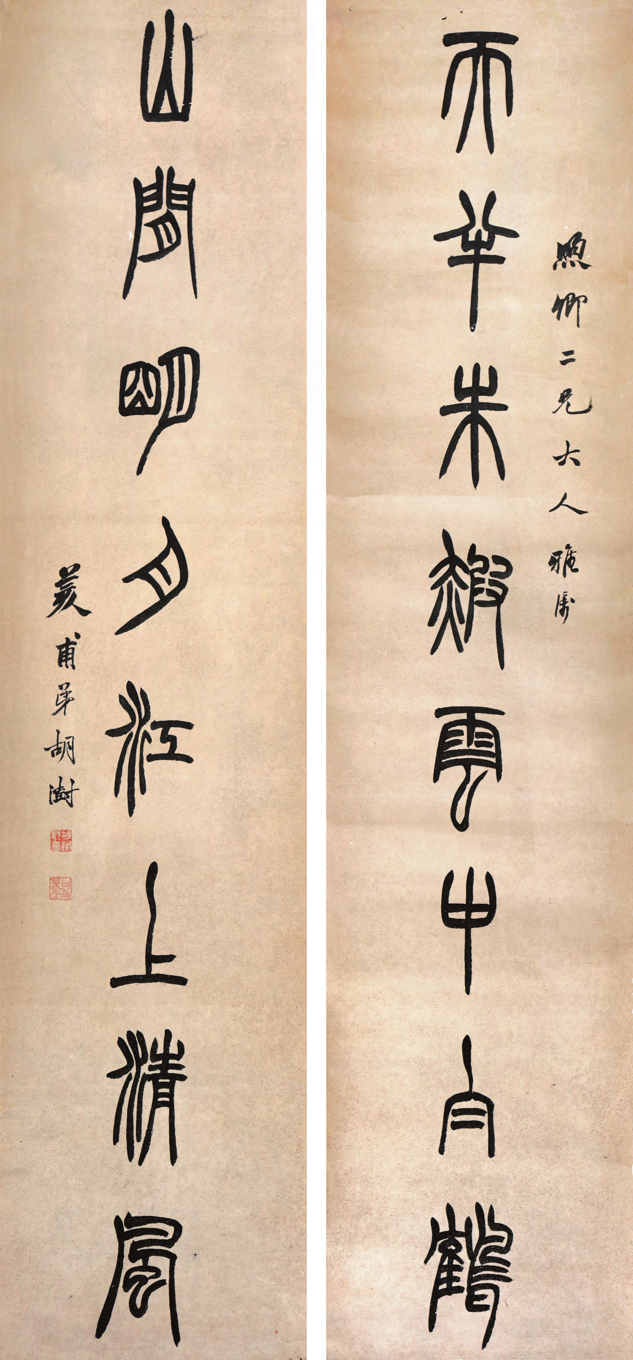 释文:天半朱霞云中白鹤,山间明月江上清风。 款署:熙卿二兄大人雅属。荄甫弟胡澍。 钤印:胡澍长寿(白文)、曰篆分伯(朱文)