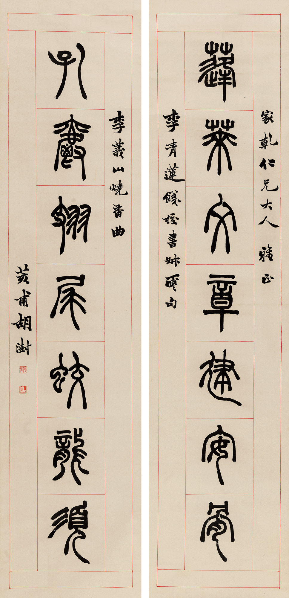 款识:家乾仁兄大人雅正。李青莲《饯校书叔云》句,李义山《烧香曲》。荄甫胡澍。