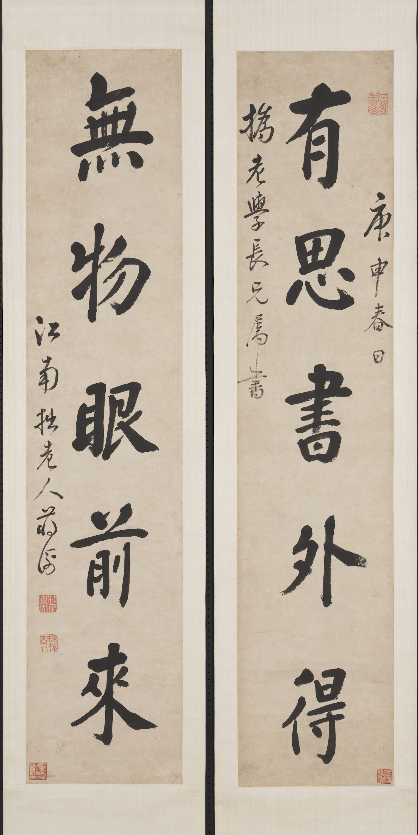 蒋衡《楷书有思无物五言联》纸本 104.2×22cm 1740年 台北故宫博物院藏 释文:有思书外得。无物眼前来。 款识:庚申春日。撝老学长兄属书。江南拙老人蒋衡。 钤印:仁者寿(朱文)、江南衡(白文)、拙存老人(朱文) 【资料来源】台北故宫博物院藏购书00135900000